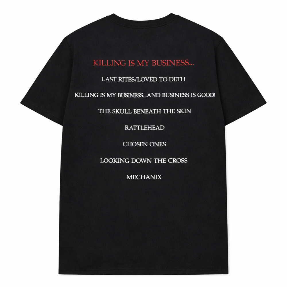 記念すべき85年作のデビューアルバムをリミックス&リマスターしジャケも新装され2018年に再リリースした「Killing Is My Business...And Business Is Good! -The Final Kill」のジャケットアートワークのTシャツ。